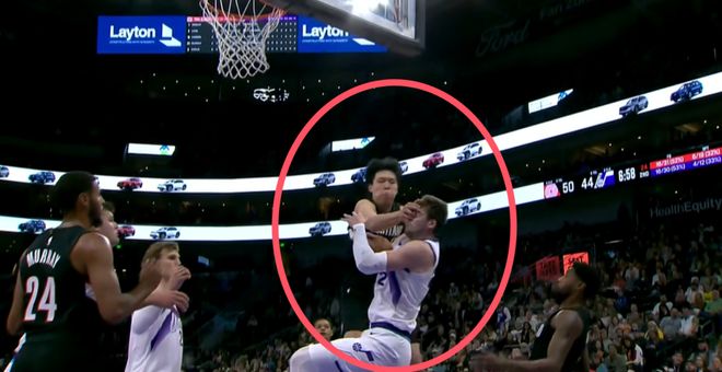 首節楊瀚森就曾經被凱斯勒完成了一次隔扣,當時凱斯勒和隊友配合配合的很默契,接到傳球后順勢切入,趁著楊瀚森注意力被牽扯的情況下,切入內線隔扣小楊。當時被隔扣了,小楊的眼神是非常兇狠的,顯然從心里就覺得你敢隔扣我,我一定要打回來,果然楊瀚森在第2節用自己的方式給出了回應。